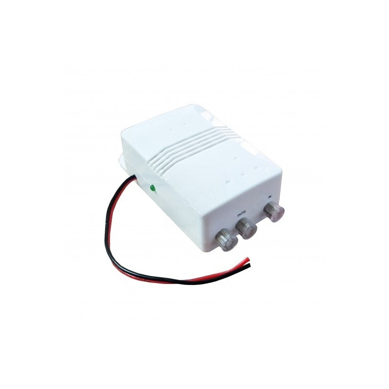 Amplificador de señal Zodiac para antenas, ideal para mejorar la recepción en VHF y UHF. Este amplificador está diseñado para funcionar con sistemas de 12V y es compatible con dos televisores simultáneamente.