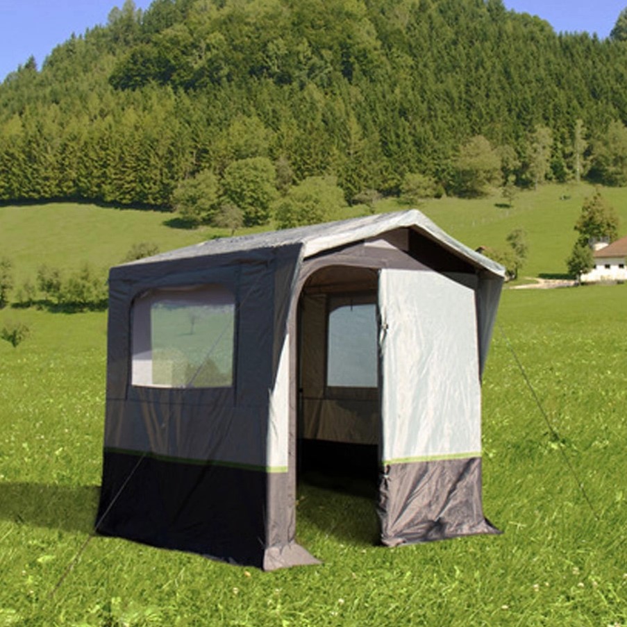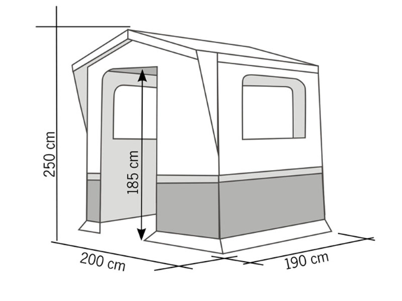 Tienda de cocina robusta, también se puede utilizar como trastero o vestuario, con gran puerta de entrada (se puede enrollar hacia un lado), robustos postes de acero de Ø19 mm, grandes ventanas con mosquitera y cubierta exterior en los lados, alta ventilación.
