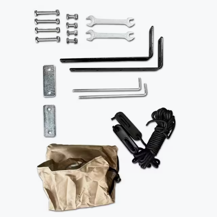 - Kit de Montaje: Soportes en forma de ‘L’, tornillería variada, piquetas y llaves fijas.