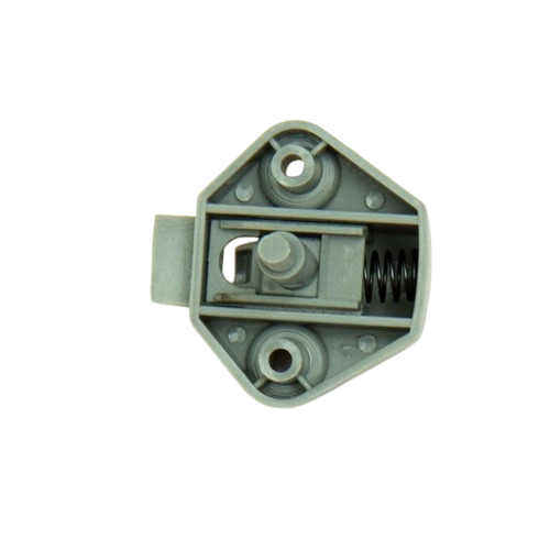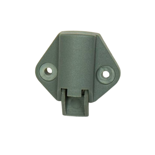 Este cajetín macho de color gris es una pieza de repuesto esencial para el sistema de cierre de asa utilizado comúnmente en puertas, portones o ventanas de caravanas, autocaravanas y campers. Es el componente fijo que se monta en el marco o carrocería y donde engancha la parte móvil del cierre (el asa).
