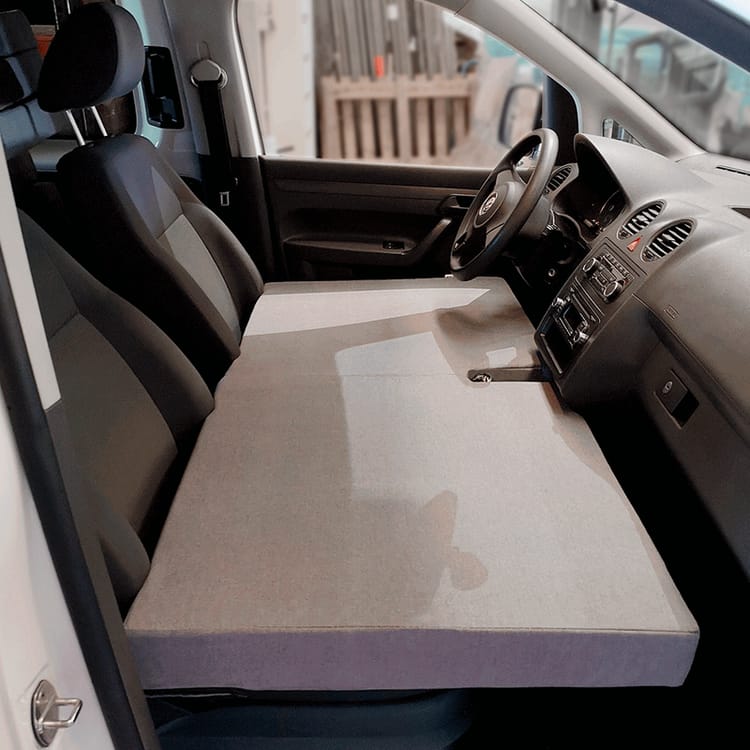 La cama adicional se ensambla en unos simples pasos: despliegue en la cabina, deslícela a su posición, ajuste los asientos delanteros hacia adelante tanto como sea posible, pase el cinturón del pasajero alrededor de la parte delantera de la cama y abróchelo para mayor resistencia.