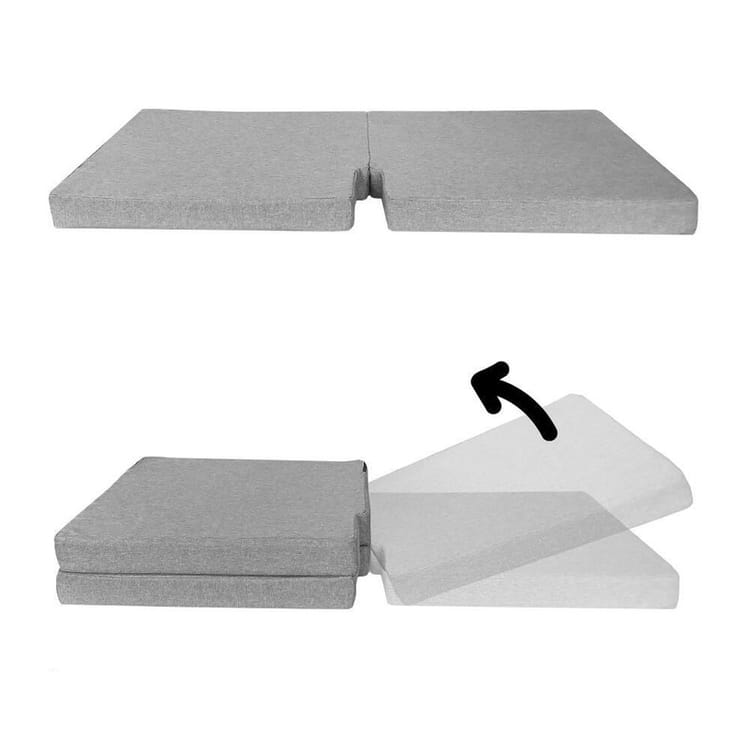 Colchón plegable para cabina de 8 cm de altura fabricado en espuma fría de 7 cm (densidad 25 kg/m3) y tablero de MDF de 1 cm con funda gris.