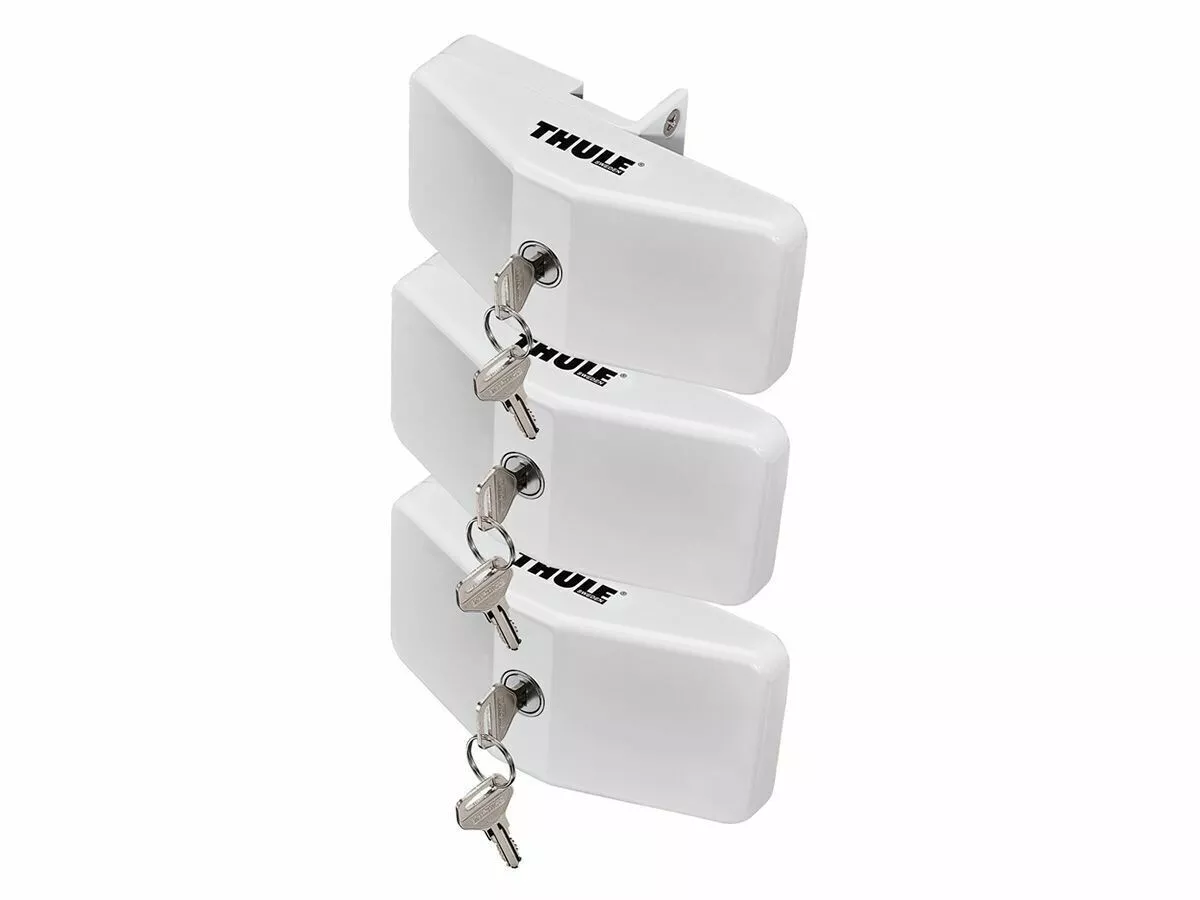 Kit de Cierres de Seguridad Thule Door Frame Lock, compuesto por 3 piezas diseñadas para fortalecer la seguridad de las puertas de tu autocaravana o caravana tanto desde el interior como el exterior.