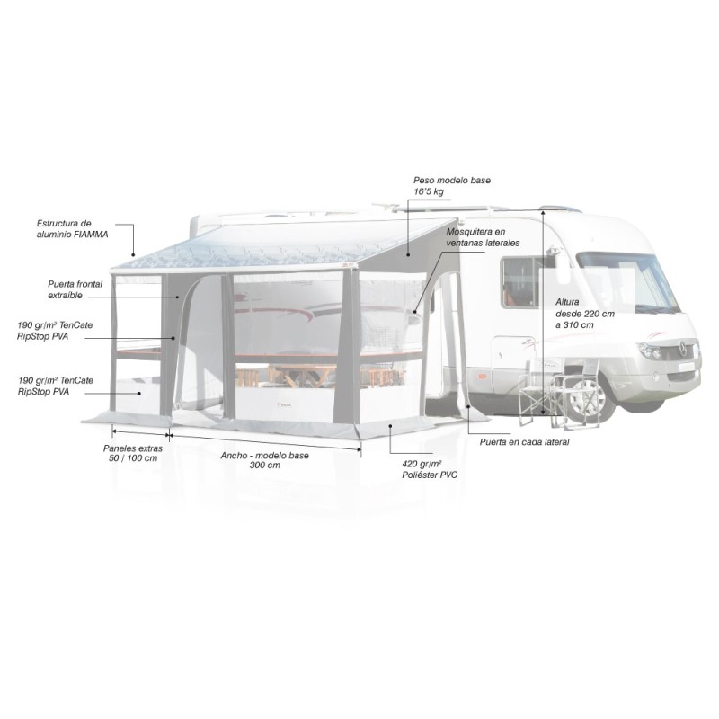 - Incluye el sistema Clip System original de Fiamma: Estructura de aluminio que se acopla al toldo, garantizando un cierre estanco y una instalación rápida.