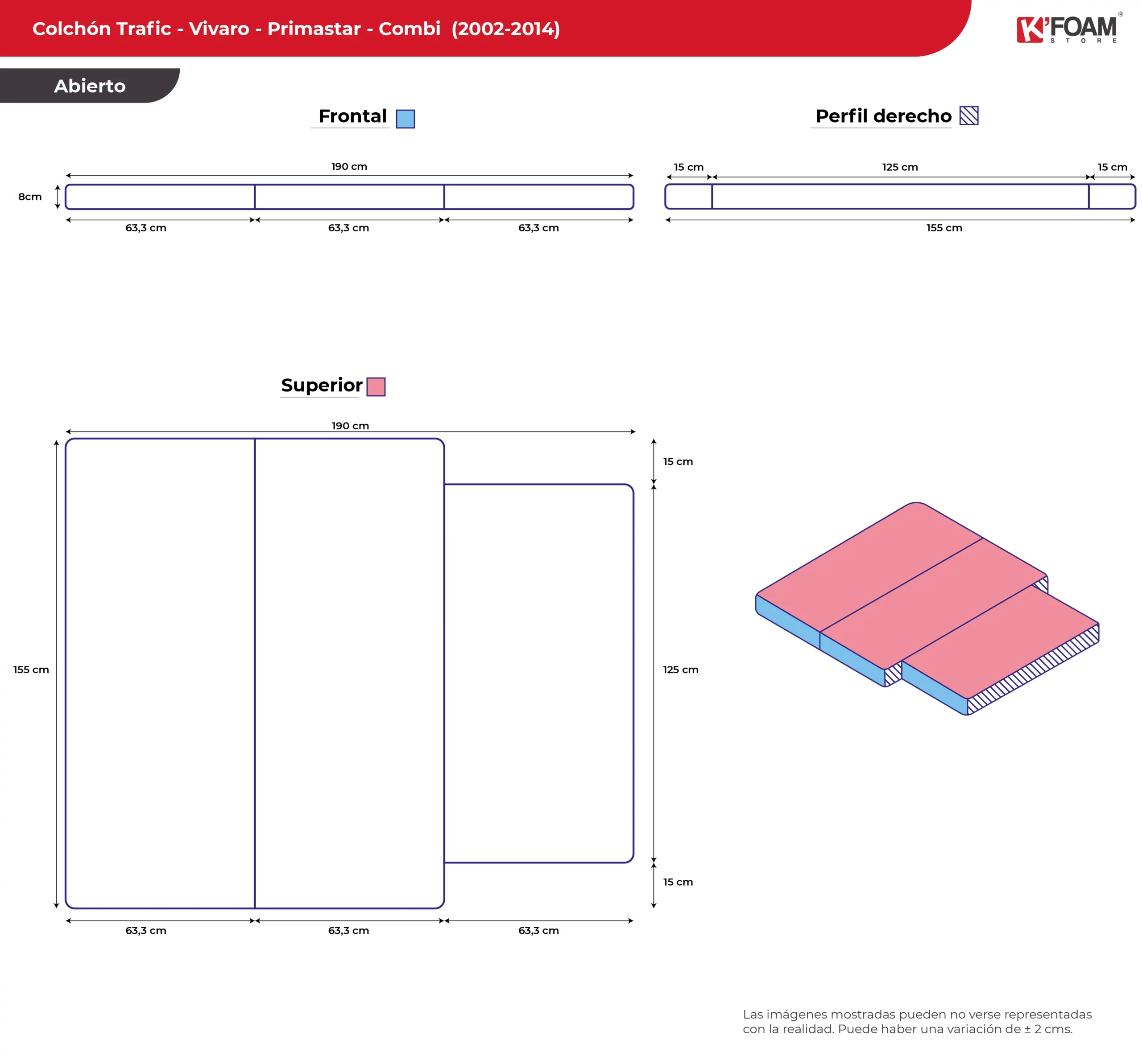 Colchón plegable para Renault Trafic, Opel Vivaro, Nissan Primastar, Fiat Talento, Nisasan NV300 desde 2002 y compuesto por 3 piezas.