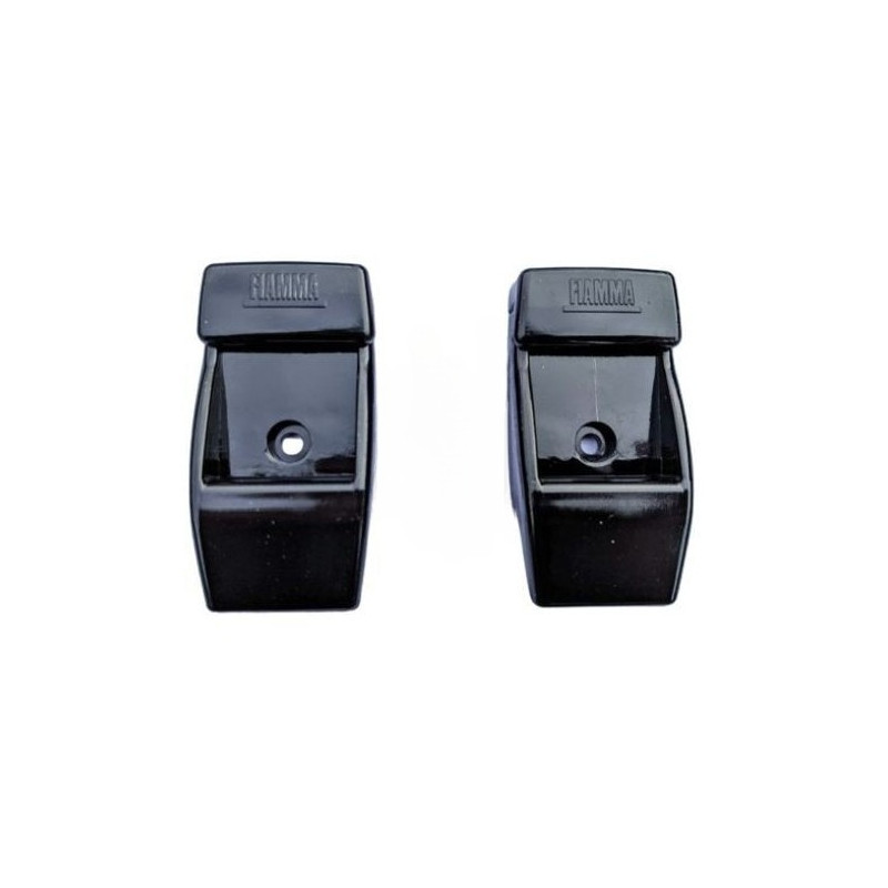 Kit de estribos de pared lateral para toldos Fiamma, diseñado para sujetar la pata del toldo contra el lateral del vehículo en situaciones donde no es posible dejarla caer verticalmente al suelo. Este soporte es ideal para aparcar en superficies duras, donde el uso de la pata en el suelo no es viable.