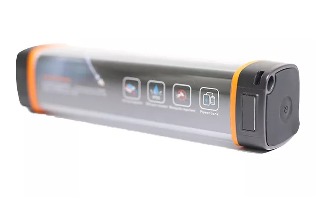 Incorpora un banco de energía integrado para que se pueda cargar un dispositivo electrónico como el teléfono móvil.