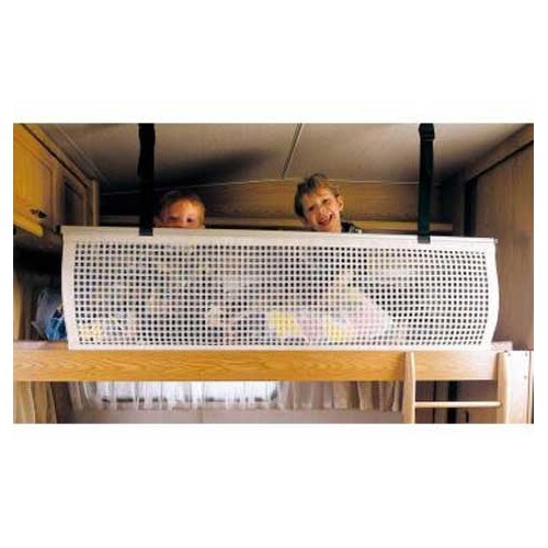Con esta red de seguridad, puede ayudar a protegerlos. Se fija al somier con cuatro tornillos y al techo con dos correas. Se puede desmontar en cuestión de segundos.