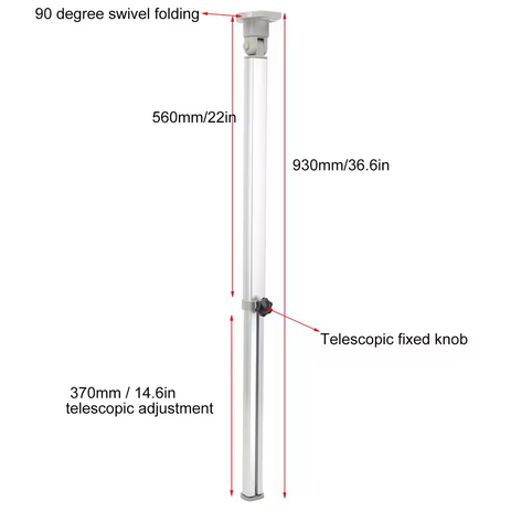 La Mesa Pata Plegable Telescópica es la solución perfecta para optimizar el espacio y la funcionalidad en tu furgoneta camper. Con una longitud ajustable entre 550 mm y 760 mm, esta pata permite un fácil almacenamiento de la mesa, además de proporcionar una plataforma estable y segura.