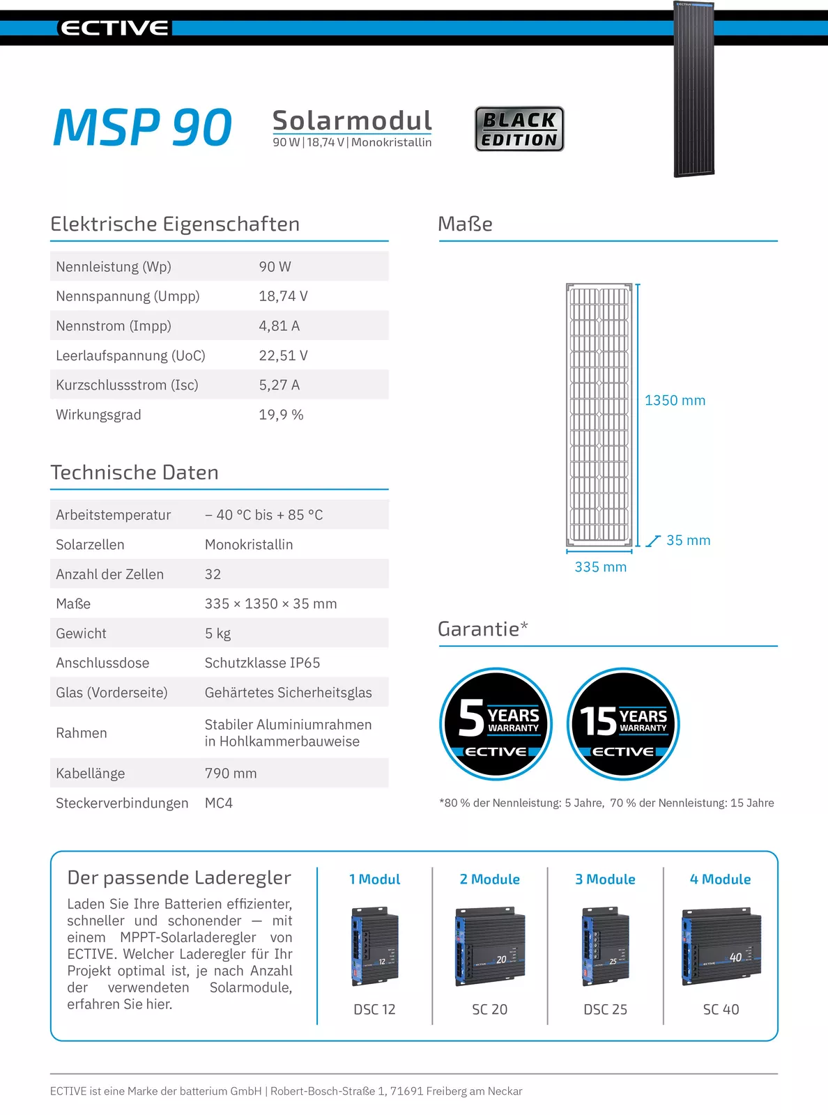 Estos módulos están listos para su uso inmediato. El conector MC4 ensamblado permite conectar los módulos directamente después de la instalación; por lo tanto, el panel solar ECTIVE MSP está inmediatamente listo para su uso y la energía del sol se utiliza inmediatamente. Esto se debe a razones prácticas: hoy en día se pierde demasiado tiempo intentando identificar enchufes con adaptadores inadecuados, renovando cables con conectores y combinando de alguna manera las diferentes tecnologías de diferentes fabricantes. Los paneles solares como el panel solar ECTIVE MSP fueron diseñados para ser respetuosos con el medio ambiente y fáciles de alimentar en la vida cotidiana. Las tecnologías engorrosas contrarrestarían esta idea.
