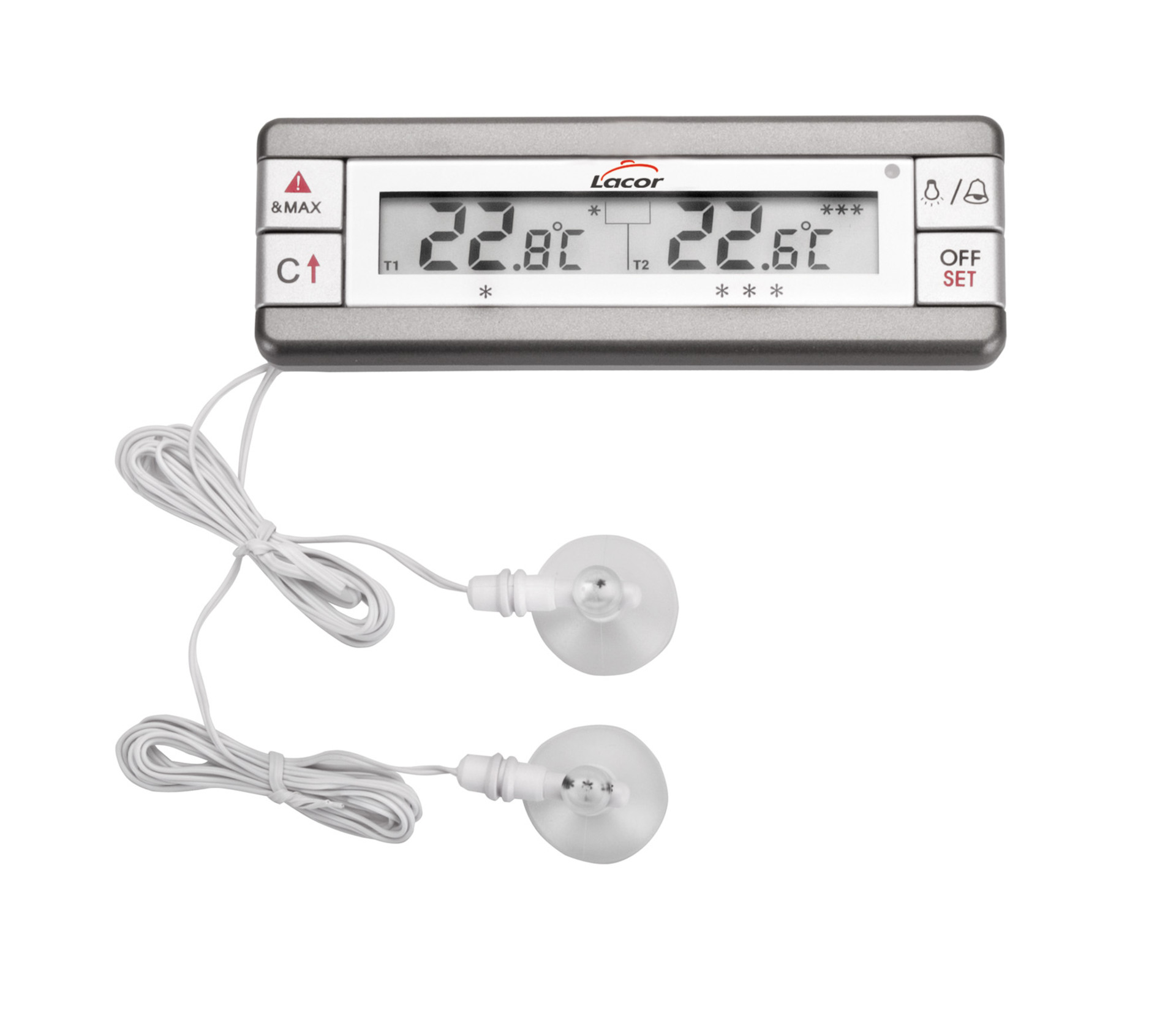Termómetro para neveras y congeladores con dos sondas, dos pantallas una para cada sonda, y alarma con sonido y luz. Una sonda mide de 0ºC a 70 ºC y la otra entre 0ºC y -40ºC. Además cuenta con una base magnética, lo que nos será muy práctico para fijarlo en la nevera o en cualquier otra superficie metálica.