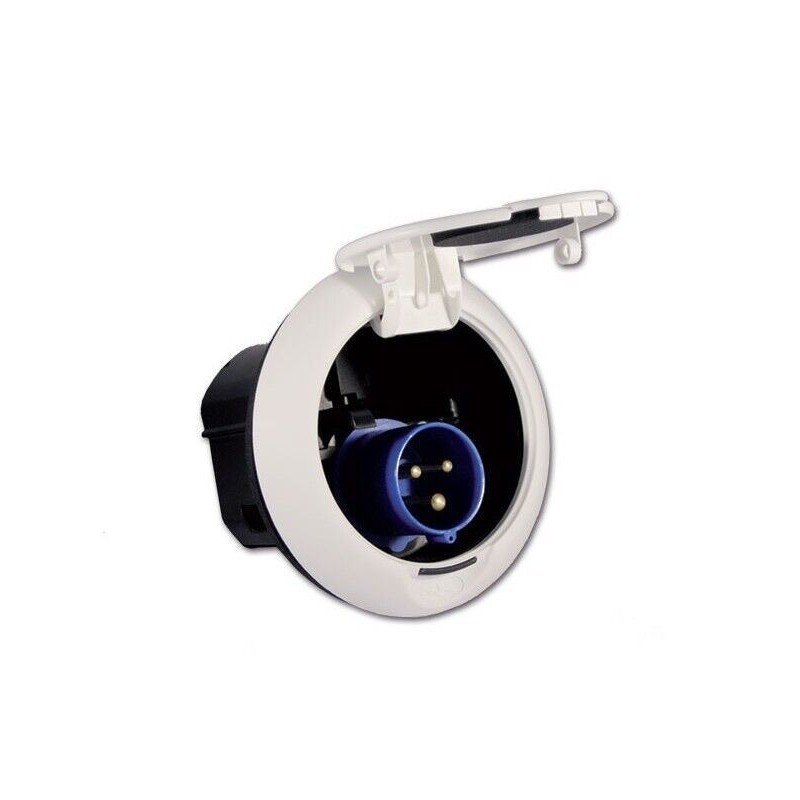 La toma de exterior CEE modelo Orus, en color blanco, es una opción de alta calidad diseñada específicamente para su uso en autocaravanas, caravanas, barcos y otros vehículos recreativos. Esta toma está optimizada para garantizar un suministro seguro y confiable de energía de 220V-250V desde una fuente externa.